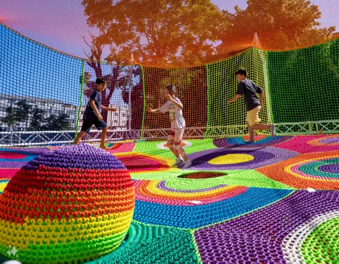 Colourful rope-net play structures that children can explore freely.