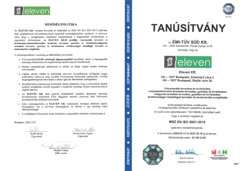 Az Eleven Kft. vezetése bevezette és működteti az MSZ EN ISO 9001:2015 szabvány által meghatározott követelményeknek megfelelő minőségirányítási rendszert. A szervezet célja, hogy a szolgáltatásai mindenkor megfeleljenek a megrendelői elvárásoknak, a jogszabályi előírásoknak.